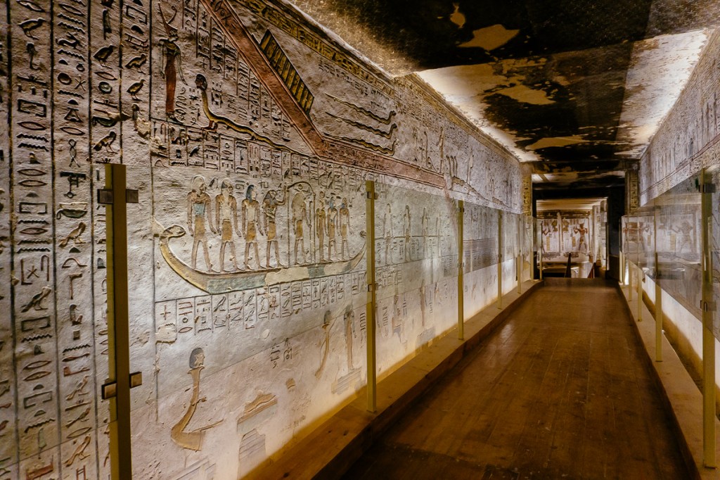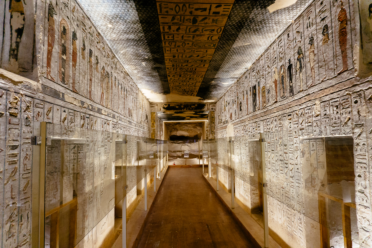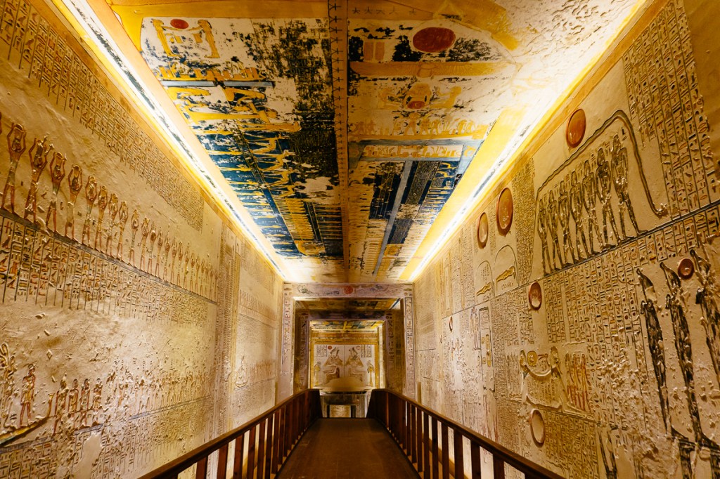 Sadly, even though this tomb is one of the longest in the valley (over 262 feet in length) visitors today are only able to proceed about halfway down the passage, as the rest of the tomb has been barred off to visitors since its ceiling collapsed due to flooding in the early 1900s. But don’t worry, for those wanting to see the red quartzite sarcophagus that would have resided in the burial chamber at the end of the tunnel, you can find it in the Louvre. However, you’ll have to travel to Cambridge to see the lid.