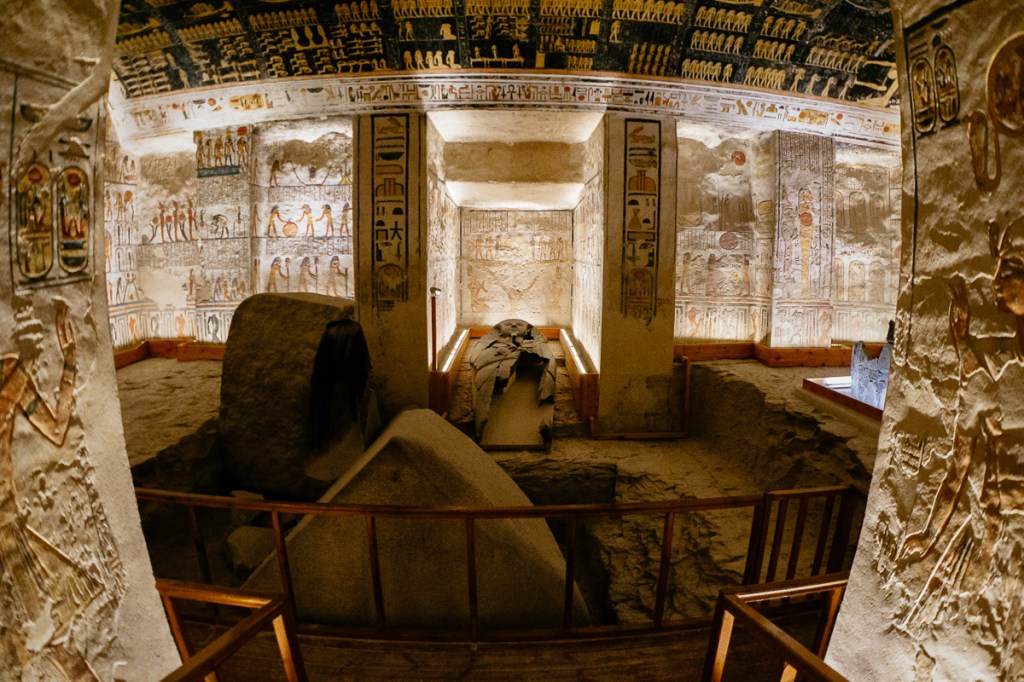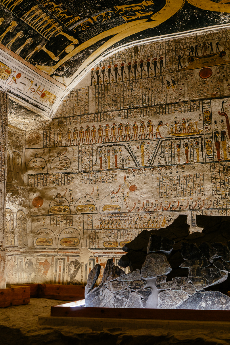The large pit in the center of the burial chamber is where the Rameses VI’s sarcophagus would have originally been interred inside a larger granite box, two huge fragments of which is all that remains today.